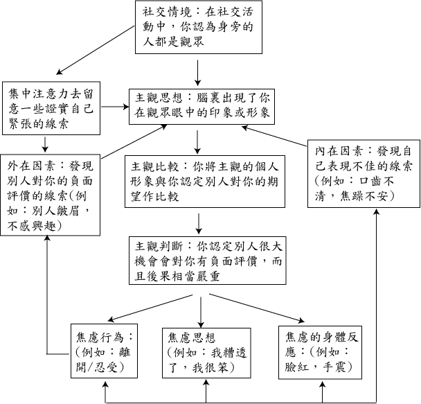 若患者長時間將注意力過份集中在自己的社交弱點之上,更把自己的弱點放大。主觀形象因而再被扭曲,自我形象更低落。這樣,社交焦慮的惡性循環便形成了。主觀形象愈差,焦慮就愈多;人愈緊張,表現愈差,主觀形象愈低落。